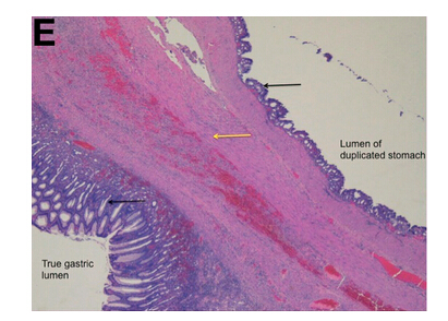 令人驚訝的是,胃大部切除標(biāo)本(圖D)檢查發(fā)現(xiàn)在疑似腫瘤的胃壁區(qū)域內(nèi)有扁平囊。這一扁平囊可以拉伸到9×8×4.5cm。胃囊與真實(shí)胃腔之間有一處共同的壁。通過(guò)此壁的組織學(xué)切片(圖E)顯示了分隔壁兩側(cè)的平滑肌細(xì)胞層和胃黏膜。這排除了GIST,證實(shí)胃重復(fù)畸形的診斷(GDC)。胃重復(fù)畸形是一種罕見(jiàn)的先天性異常,僅占胃腸道所有重復(fù)囊腫的4%至9%。大多數(shù)病例報(bào)告發(fā)生在兒童中且位于胃大彎處。GDC有以下3個(gè)特點(diǎn):(1)囊腫的壁與胃壁相連,(2)囊腫由平滑肌包圍,通過(guò)肌肉與胃壁相連,(3)囊壁排列有胃上皮或其它類(lèi)型的胃黏膜。