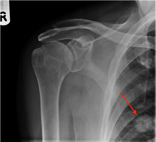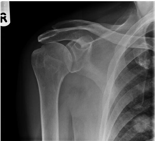 患者,男性,62歲,跌倒后,肩膀越來越疼。全科醫(yī)生要求該患者進行放射檢查(圖1)。