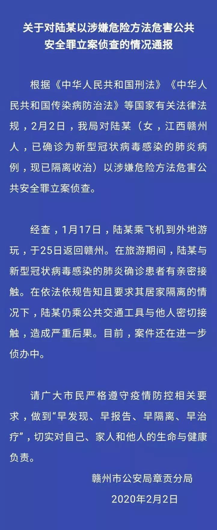 2日晚,江西贛州市公安局章貢分局通報(bào),陸某(已確診為新型冠狀病毒感染的肺炎病例,現(xiàn)已隔離收治)居家隔離期間仍乘公共交通出行,被公安機(jī)關(guān)以涉嫌危險(xiǎn)方法危害公共安全罪立案?jìng)刹?。?jīng)查,1月17日,陸某乘飛機(jī)到外地游玩,于25日返回贛州。