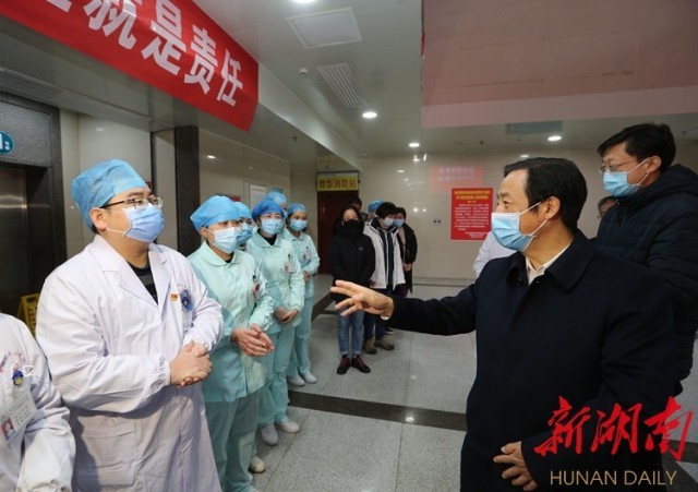 許達哲說,要提高收治率和治愈率,降低感染率和病亡率,靠的就是廣大一線醫(yī)務(wù)人員。希望大家發(fā)揮特別能吃苦、特別能戰(zhàn)斗、特別能攻關(guān)、特別能奉獻的精神,靠你們的專業(yè)素質(zhì),靠你們的愛心醫(yī)德,幫助患者早日康復(fù),代表7000多萬三湘兒女感謝大家!